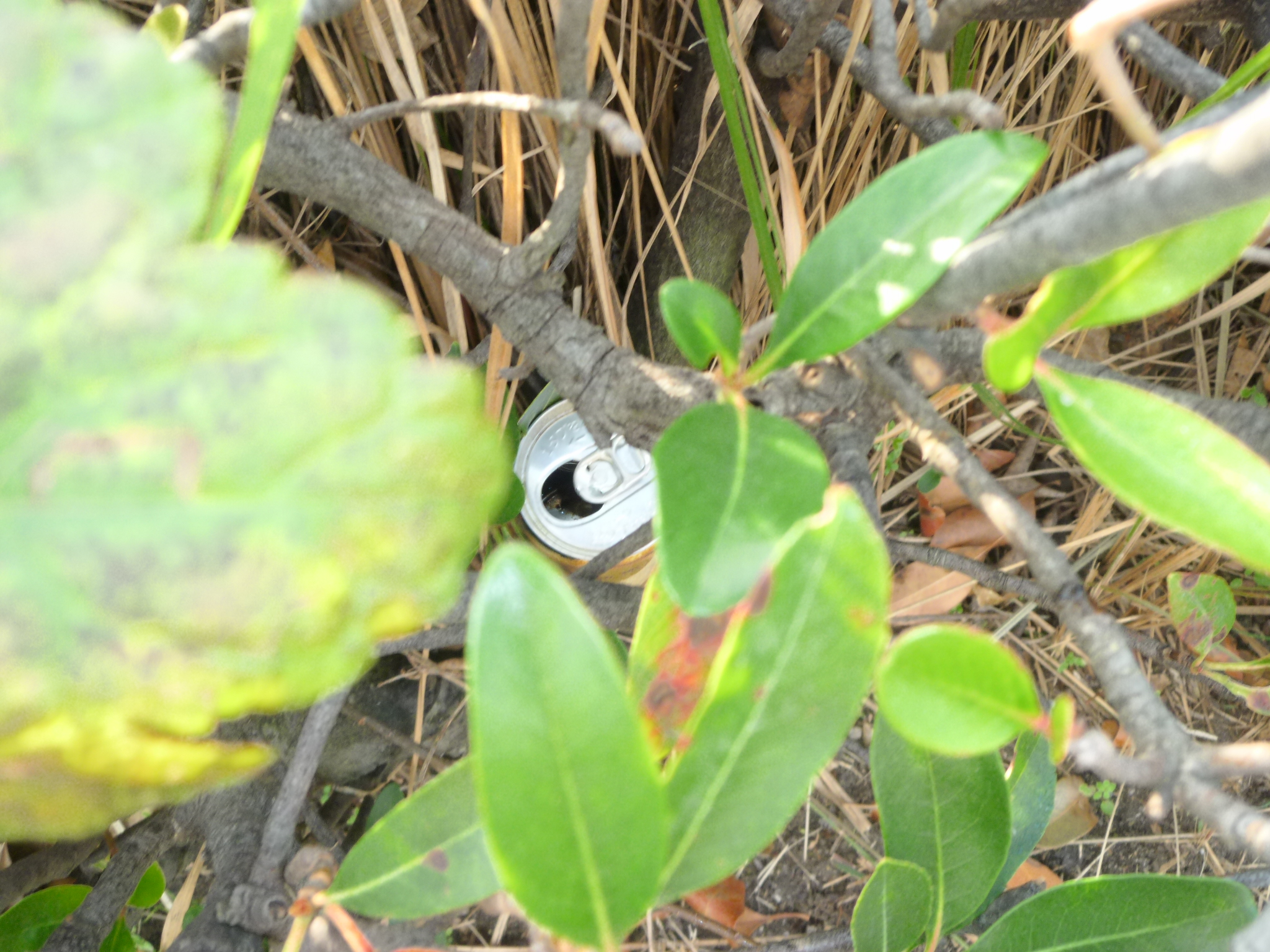 歩道の樹々に空き缶が差し込んで