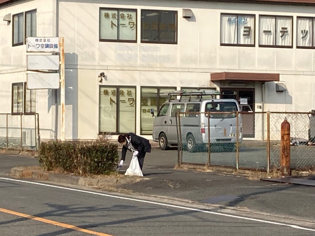 社屋前の車道と歩道の清掃を行いました。